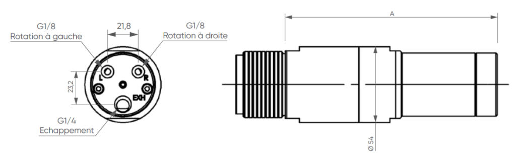| Référence | Rapport de réduction | Pression (Bars) | Vitesse (tr/min) | Couple (Nm) | Puissance max (W) | Consommation d’air (Nl/min) | Dimensions | |||||