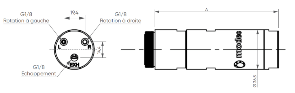 | Référence | Rapport de réduction | Pression (Bars) | Vitesse (tr/min) | Couple (Nm) | Puissance max (W) | Consommation d’air (Nl/min) | Dimensions | |||||