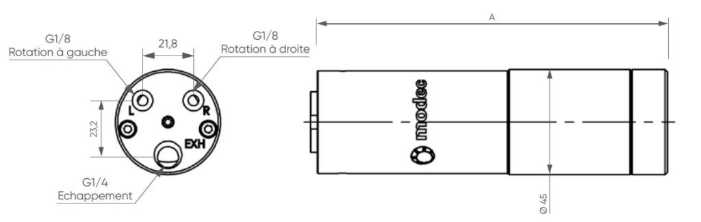 | Référence | Rapport de réduction | Pression (Bars) | Vitesse (tr/min) | Couple (Nm) | Puissance max (W) | Consommation d’air (Nl/min) | Dimensions | |||||
