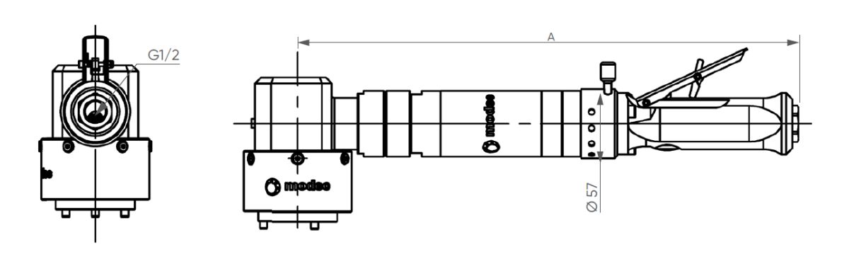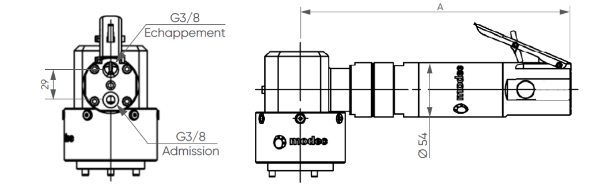 | Référence | Rapport de réduction | Pression (Bars) | Vitesse (tr/min) | Couple (Nm) | Puissance max (W) | Consommation d’air (Nl/min) | Dimensions | |||||