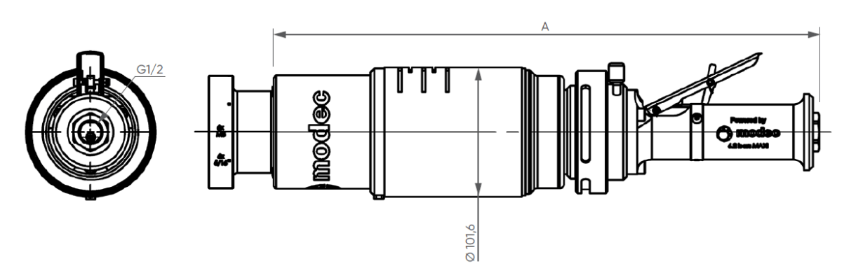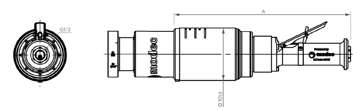 | Référence | Rapport de réduction | Pression (Bars) | Vitesse (tr/min) | Couple (Nm) | Puissance max (W) | Consommation d’air (Nl/min) | Dimensions | |||||