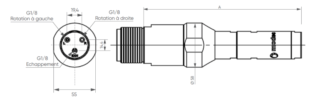 | Referencia | Relación de reducción | Presión (bares) | Velocidad (RPM) | Torque (Nm) | Potencia máxima (W) | Consumo de aire (Nl/min) | Dimensiones | |||||