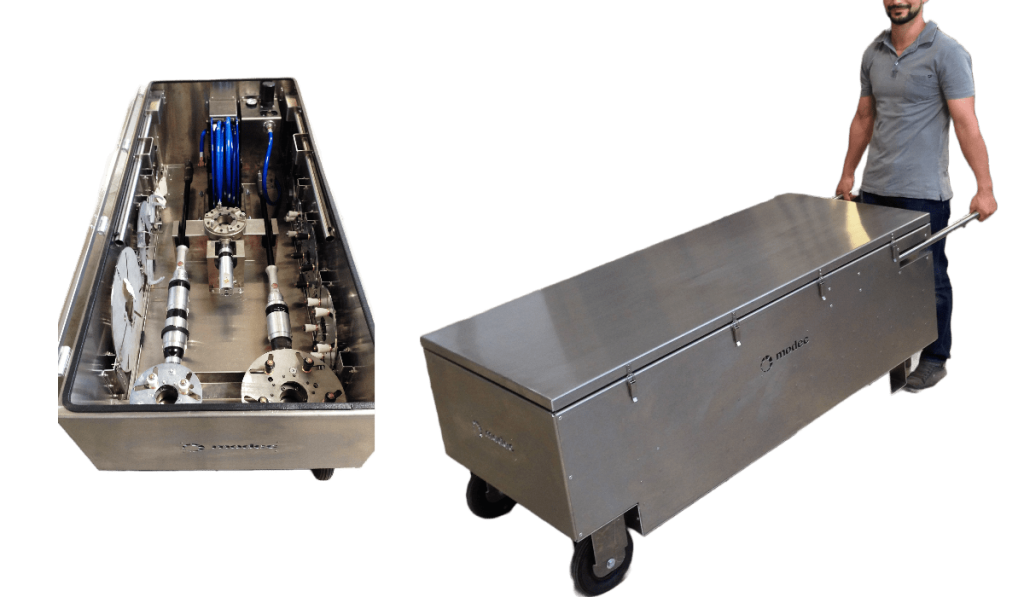 La modec Kit box peut être placée debout ou couchée, elle dispose de 2×3 roues afin de pouvoir être déplacée même dans des escaliers. L’intérieur est compartimenté de façon à ranger facilement et efficacement l’ensemble des éléments, mais aussi de pouvoir les mettre en œuvre rapidement. Elle peut par exemple contenir l’unité FRL et un tuyau d’alimentation en air sur enrouleur dans le cas d’un actionneur pneumatique.