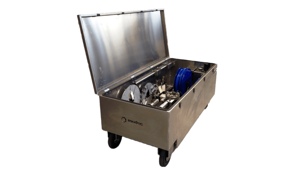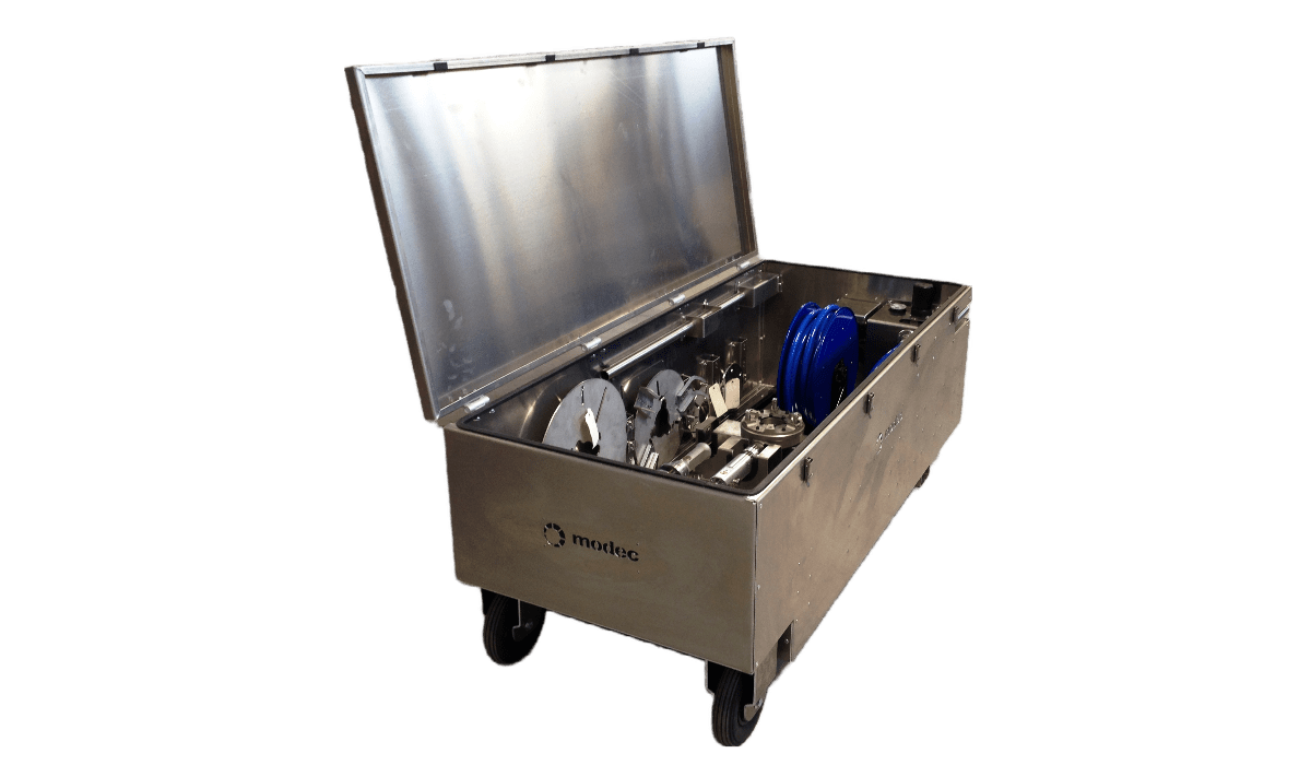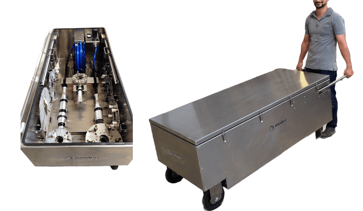 Destinée à un usage intensif et professionnel, la «modec kit box» est une caisse métallique pouvant contenir l’ensemble du matériel nécessaire aux opérations (actionneurs, adaptateurs, systèmes de reprise de couple, batteries, chargeurs, FRL, tuyau d’alimentation d’air…) de manière à pouvoir facilement transporter l’ensemble des éléments sur la zone de travail et de bénéficier d’une mise en œuvre rapide et facile.