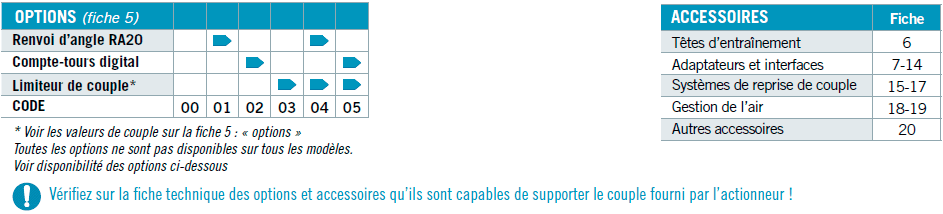 Vérifiez sur la fiche technique des options et accessoires qu'ils sont capables de supporter le couple fournis par l'actionneur.